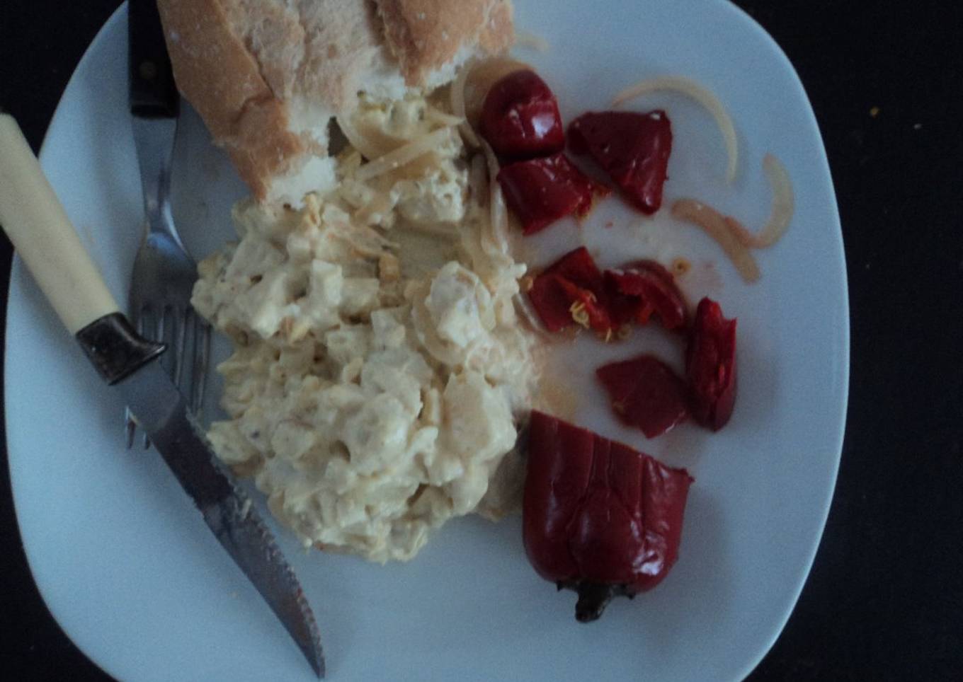 Ensalada de papa, huevo cocido, cebolla, dados de queso de puerco y cacahuate con mayonesa de chiles
