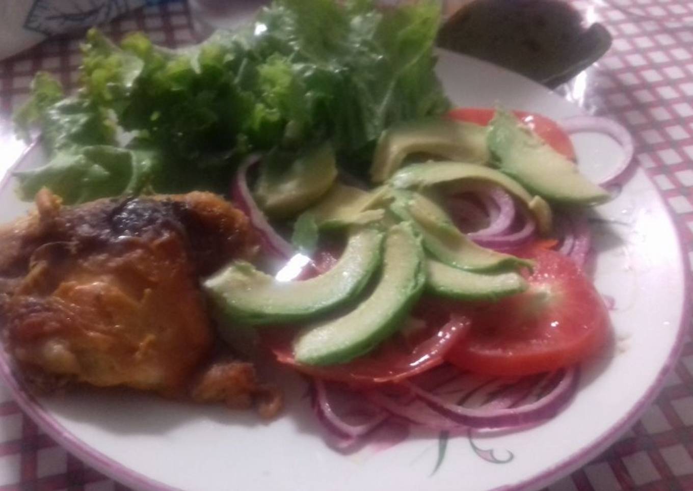 - Poner una pieza de pollo en un plato plano, unas hojas de lechuga, unas rodajas de cebolla, jitomate, aguacate y bañarlas con aderezo o vinagreta, llevar a la mesa, acompañar con tortillas de maíz y salsa picante casera.