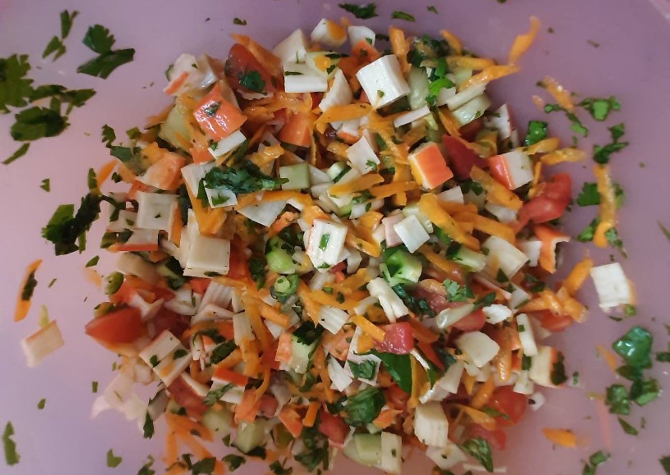 - Lava muy bien toda la verdura, pela zanahoria, pepino, corta todo en cuadritos, la zanahoria va rallada, corta el surimi en trocitos.