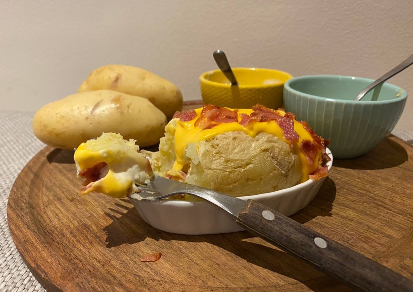 - Pinchar bien la papa lavada. Cocinar en microondas por aprox 7 minutos d谩ndola vuelta a la mitad de la cocci贸n. El tiempo puede variar dependiendo de la papa y la potencia del microondas. Ac谩 en M茅xico suelen ser m谩s chicas. La papa debe estar tierna al pincharla con un tenedor.