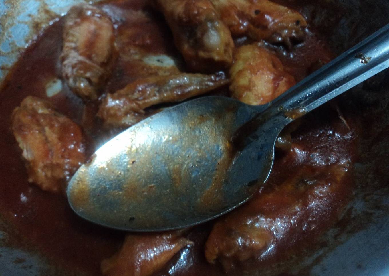 - Ya cuando están integrados homogéneamente todos los ingredientes se ponen las alitas a que se impregnen del sabor, dejamos hervir, rectificamos sal ya después de dos hervores apagar y dejar reposar por media hora, prendemos el fuego nuevamente, dejamos que de el hervor y servimos caliente, con arroz, acompañado de tortillas.