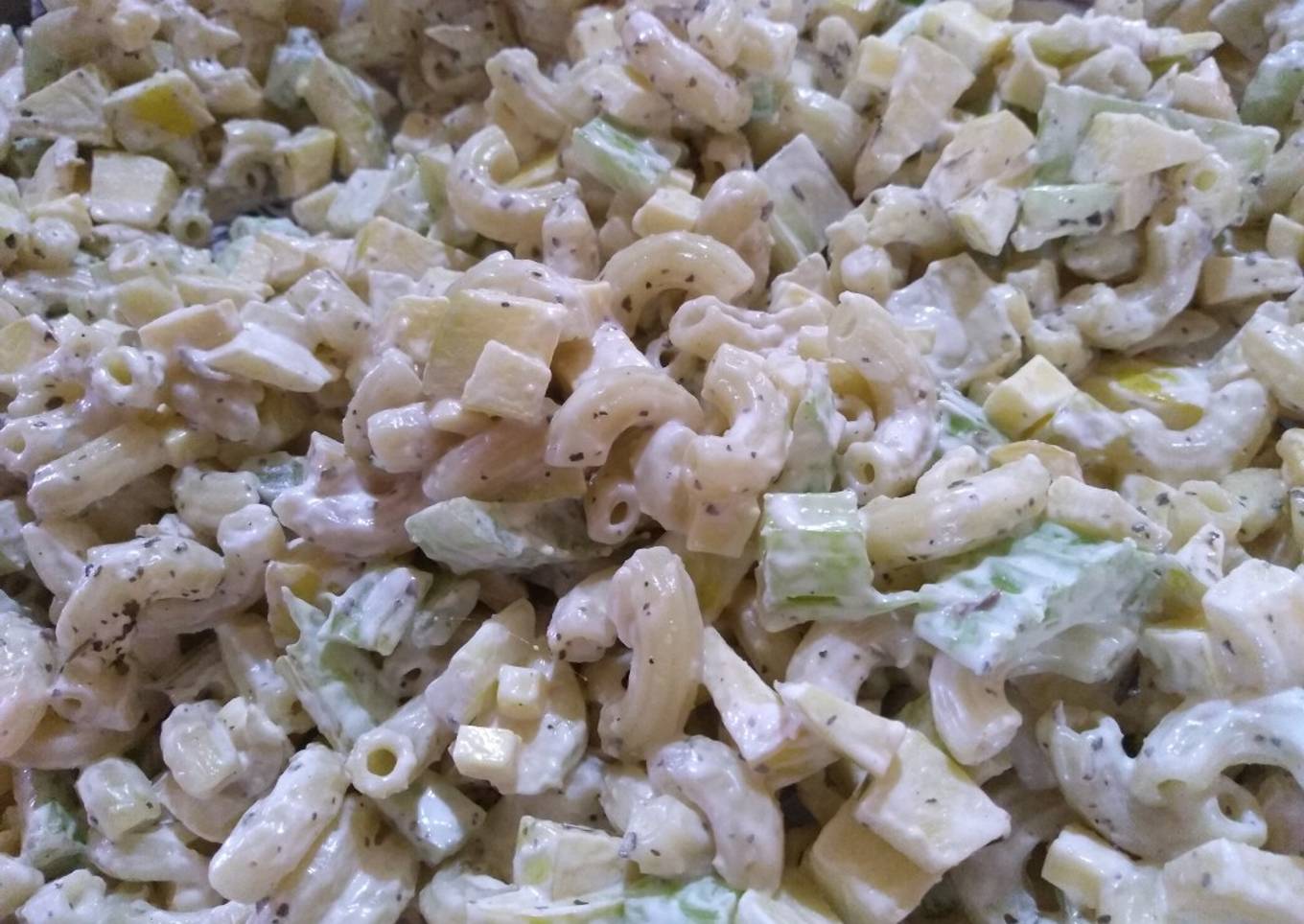 - En un bowl vacía los coditos y ve agregando los demás ingredientes, manzana, apio, queso, sal, pimienta, ajo, albacar, crema y mayonesa, revuelve perfectamente y listo.