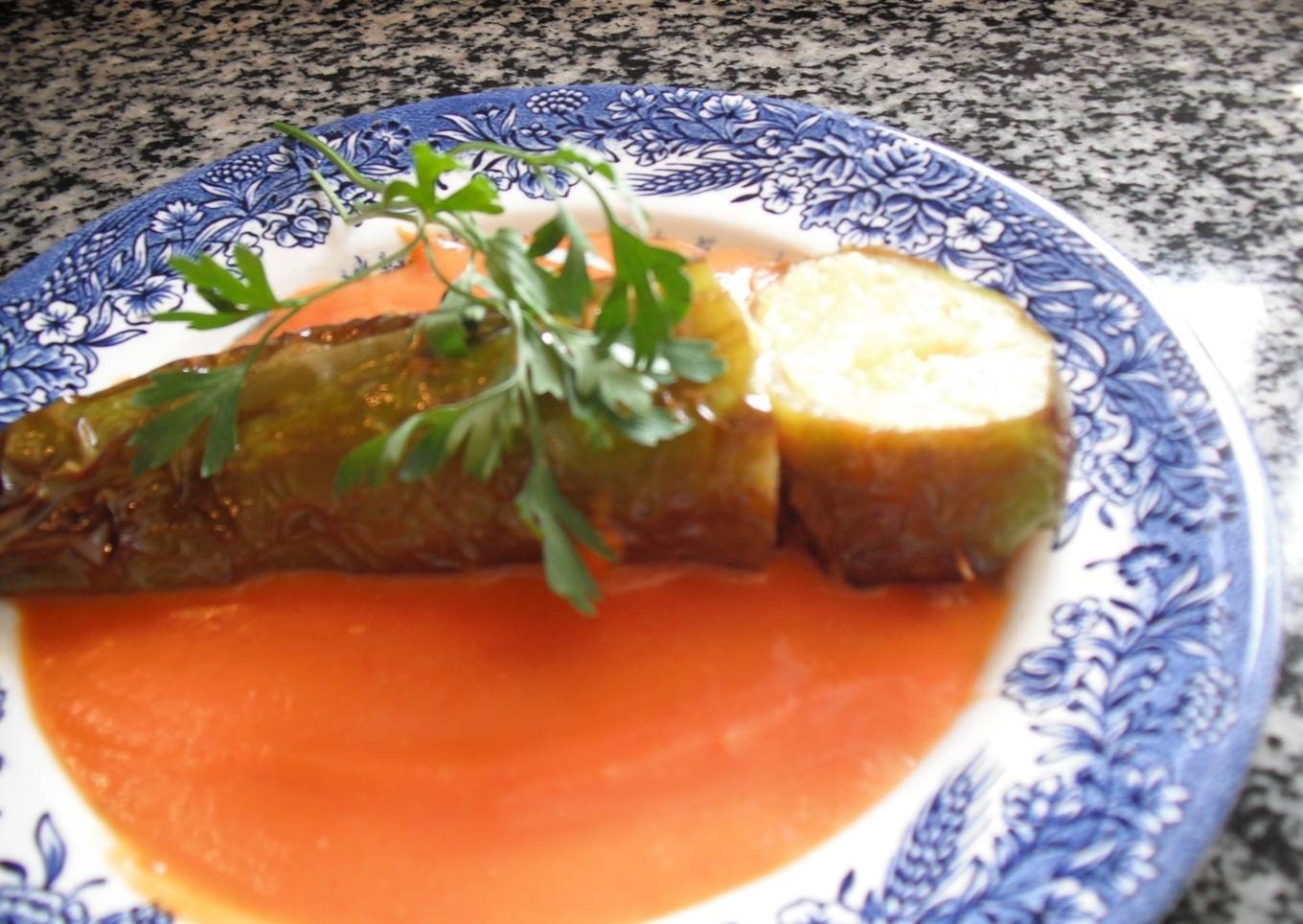 Pimientos rellenos de revuelto de patata frita con huevo y una cama de salmorejo.