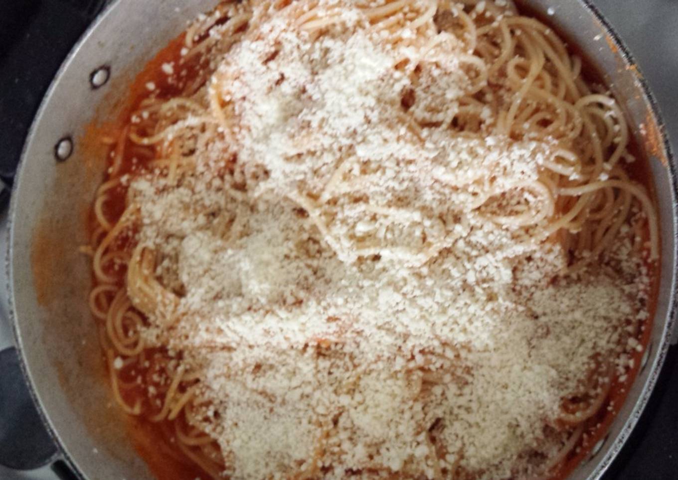 - Ya que se sazonó se le agrega el spaguetti, revuelve bien para integrarlo con el jitomate y por último el queso cotija rallado. Lo dejas unos 5 min. más tapado para que se funda un poco el queso. Y sentarse a la mesa a degustar este rico spaguetti.