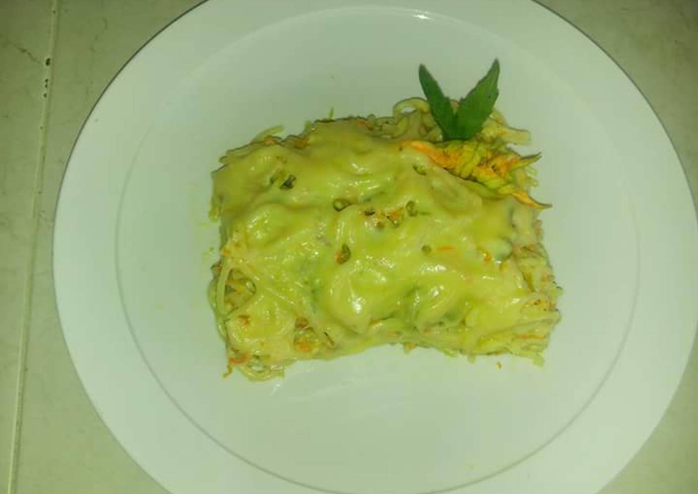 - Vamos poner la mezcla del espagueti en un refractario y vamos a cubrir con suficiente queso manchego y lo ponemos en el horno hasta que gratine servir caliente excelente Buen provecho.