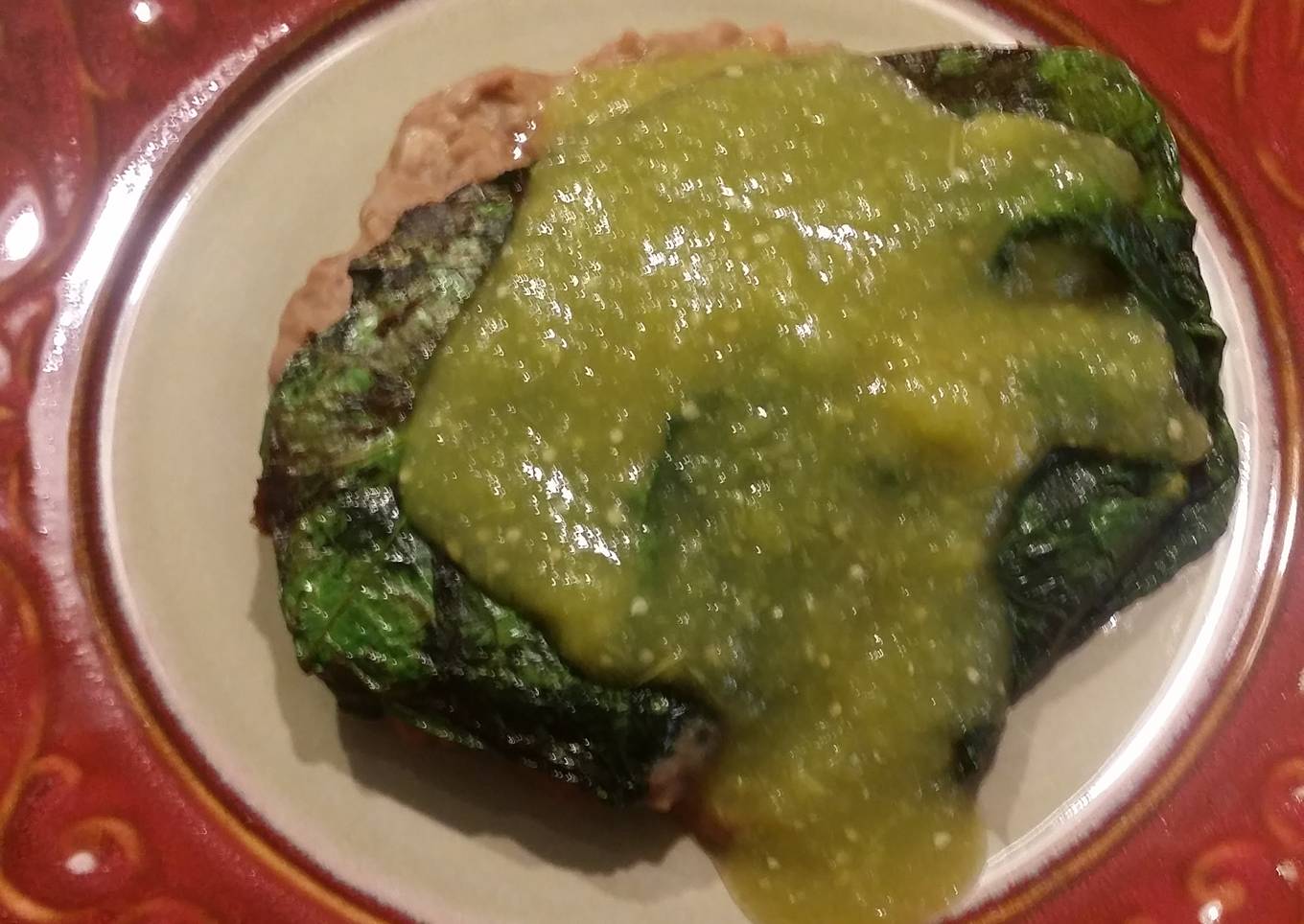 - Monta el plato, poniendo una capa de frijoles refritos, encima pon un paquetito de pescado y baña con la salsa verde.