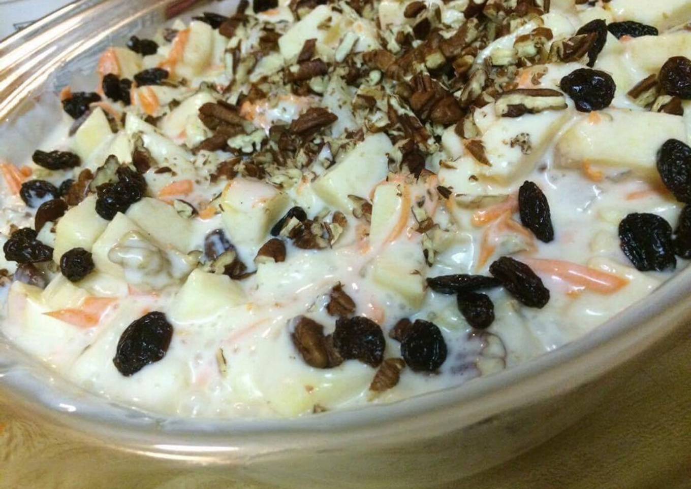 - Las manzanas se ponen picadas en agua con el jugo de medio limón, con el objetivo de que no se oxiden, se dejan por unos 2 minutos y se escurren. Se rallan las zanahorias y se mezclan junto con la mezcla de la crema. Al igual agregas las manzanas. La piña es aquí donde tienes que agregarla. Mueves perfectamente.Por último pones un poquito de pasas encima, y otro poco de nueces. Y a saborear!!