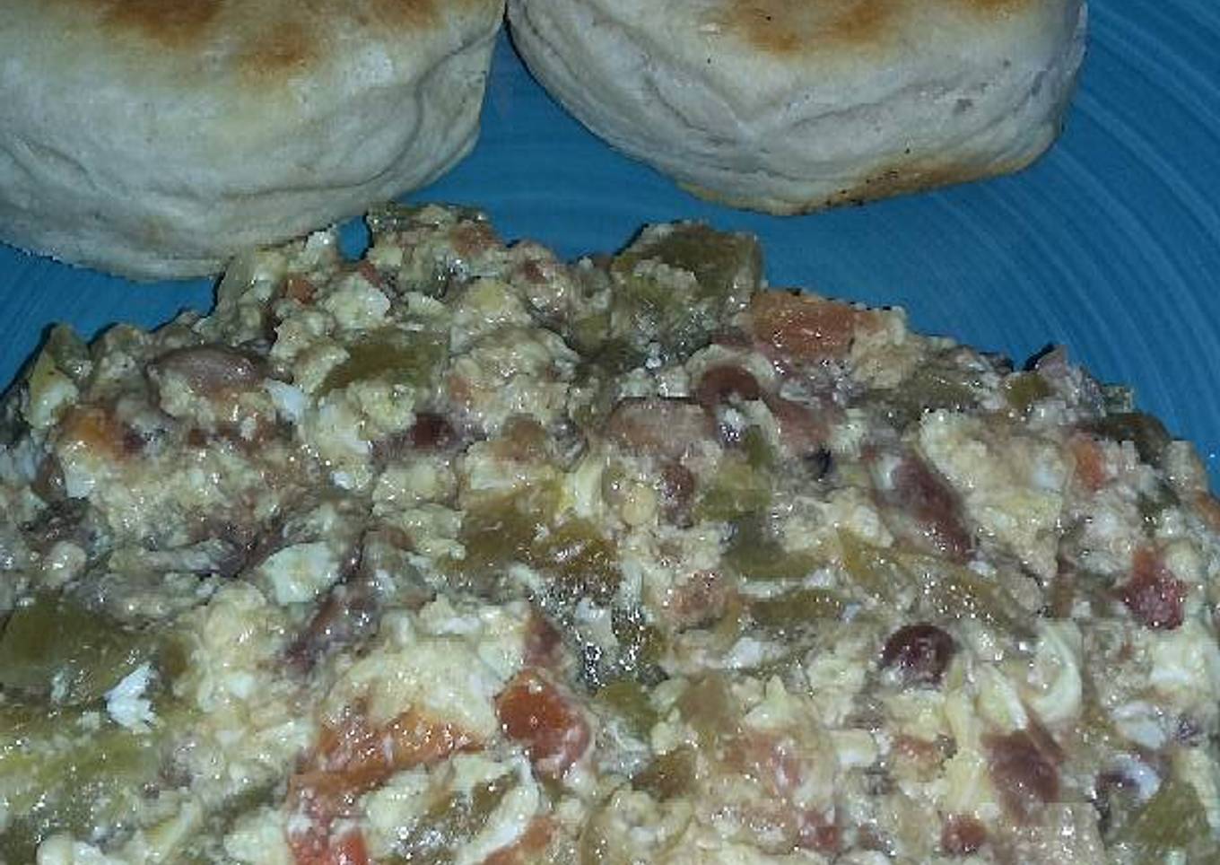 Huevos revueltos, con un guiso de chile california con queso y frijoles refritos.